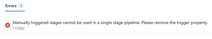 And if your pipeline contains only one stage, then it also cannot be marked as manual, because you will get the below error: